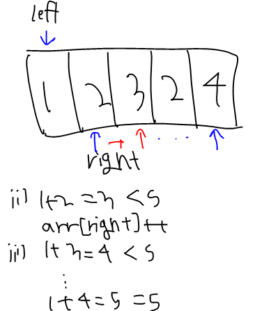 5와 같을 경우 right포인터 증가 후 arr[right]를 증가시키거나, left포인터 증가 후 arr[left]값을 빼주는데 후자의 경우는 left 인덱스가 right 인덱스를 넘어서는 경우를 고려해야 된다.